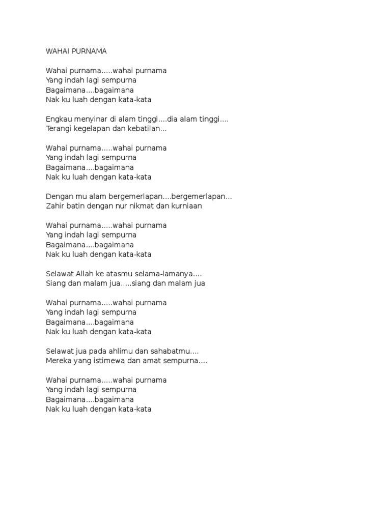 Wahai purnamawahai purnama Yang indah lagi sempurna Bagaimanabagaimana Nak ku luah dengan kata-kata Selawat jua pada ahlimu dan sahabatmu2 kali Mereka yang istimewa dan amat sempurna. YANG INDAH LAGI SEMPURNA. Wahai purnama berilah aku terang Purnama gst Lainnya.
